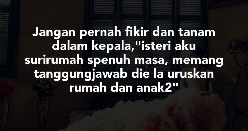Saya tak ade tempat nak meluah. Saya cuma nak pesan pada suami2 sekalian, rajin2kan lah cuba baca posting2 ustaz ebit lew. Mana2 tugas yang boleh bantu, bantu lah.. Jangan diletak semua atas bahu dan kepala isteri. Ringanakan sikit kerja2 isteri. Jangan pernah fikir dan tanam dalam kepala,”isteri aku surirumah spenuh masa, memang tanggungjawab die la uruskan rumah dan anak2″.. Jangan pernah sekali..