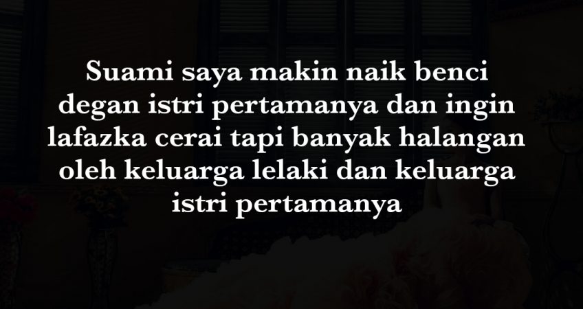 Suami saya makin naik benci degan istri pertamanya dan ingin lafazka cerai tapi banyak halangan oleh keluarga lelaki dan keluarga istri pertamanya . Pendapat semua yang baca ni . Apa perlu saya buat ye ? Berdiam diri ? Sebab nama saya buruk sedangkan saya taktahu pape tapi saya yang kene . Dari awal lagi dorang memang tak suka pada saya . Jadi bila dah jadi macamni dorang atack saya yang nak musnahkan lagi . Terima kasih min jika siarkan cerita ni . Maaf agak panjang