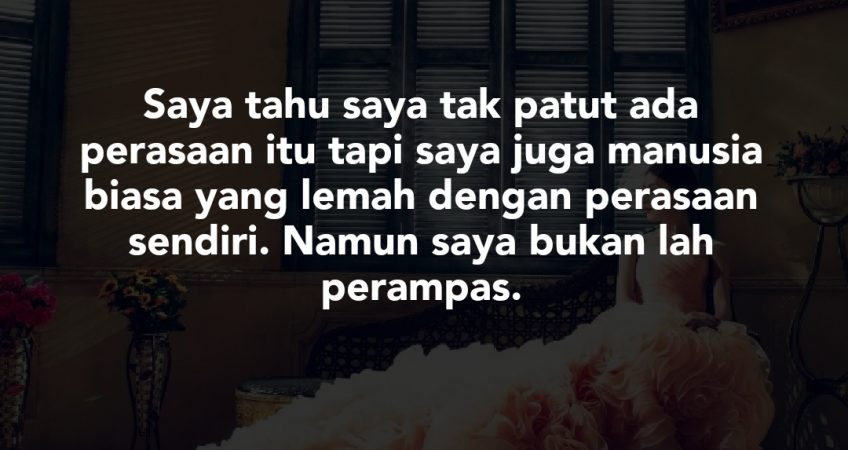 Sejak dari hari itu, hidup saya kembali kelam. Tapi dia tak terus meningglkan saya, dia masih ada bersama saya pada hari-hari berikutnya. Kerana rasa terikat, saya menjadi rapat dengan dia dan akhirnya muncul satu perasaan yang tak sepatutnya wujud. Saya semakin hari semakin sayang pada dia. Saya tahu saya tak patut ada perasaan itu tapi saya juga manusia biasa yang lemah dengan perasaan sendiri. Namun saya bukan lah perampas. Tak pernah sekalipun terlintas dalam fikiran saya untuk merosakkan rumah tangga orang.