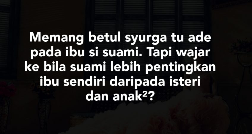 Sampai satu hari, aku bergaduh dengan dia. Puncanya, satu haritu dia cuti. Dan dia bangun awal pagi. Terus balik ke rumah mak dia.. Tanpa bagitahu ape² kt aku.. Aku pun mcm hmmmm ok la. Mungkin dia keluar beli kuih ke untuk anak dia. Sebab sebelum tu anak aku ade mintak dia nasi lemak. Petang bila dia balik dia cakap tadi bawak mak dia, pergi sarapan kat kedai and belikan lauk basah kat pasar.. Sedangkan aku? Aku duduk rumah, berbasah baju jaga anak,.. Aku jadi angin satu badan bila dia cuti tapi pergi bersarapan bagai dengan mak dia. Langsung tak ingat anak bini. Kesian anak aku tunggu bapak dia belikan nasi lemak pagi tu. Agaknya apa yang perlu aku buat? Kadang² sampai aku terpikir, mak mertua aku tu menyesal ke kahwin aku dengan anak dia? Aku bukam cemburu laki aku lebihkan mak dia ke ape. Tapi aku kesal. Makin lama dia makin jadik berat sebelah.