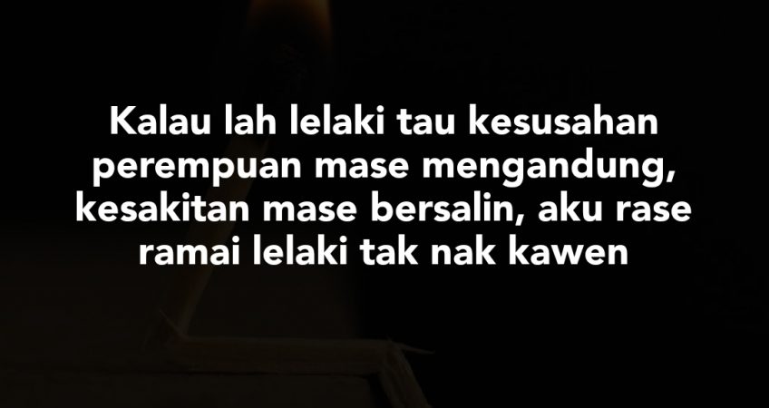 Kadang2 aku terfikir, aku ke yang mengada2 sangat lepas bersalin ni. Kalau lah lelaki tau kesusahan perempuan mase mengandung, kesakitan mase bersalin, aku rase ramai lelaki tak nak kawen. Susah ke nak cakap terima kasih sebab dah mengandungkan dan dah melahirkan anak die. Siap package, kene jage anak + kene keje untuk tolong suami cari rezeki. Tiap2 tahun memang laki aku tak ade duit ke nak celebrate birthday aku tahun ni wish pon aku yang mintak Aku salah pilih suami ke ? Aku da salah jalan ke? Allah nak uji aku ke sekarang ni?